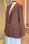 Blazer feminino em alfaiataria com fechamento frontal por botões e bolsos decorativos (fakes), confeccionado no clássico tecido risca de giz. A padronagem fina e elegante traz um ar formal e sofisticado à peça, enquanto o corte reto e estruturado proporciona um caimento impecável. Ideal para composições refinadas, é uma escolha versátil que eleva qualquer produção com estilo e presença.
