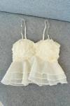 Blusa confeccionada em tecido leve e delicado, com busto estruturado em aplicações florais tridimensionais que proporcionam textura e um visual romântico. Possui alças finas ajustáveis e barra em camadas de tecido transparente, criando movimento e leveza. O modelo tem caimento solto na parte inferior e valoriza a silhueta com charme e feminilidade.