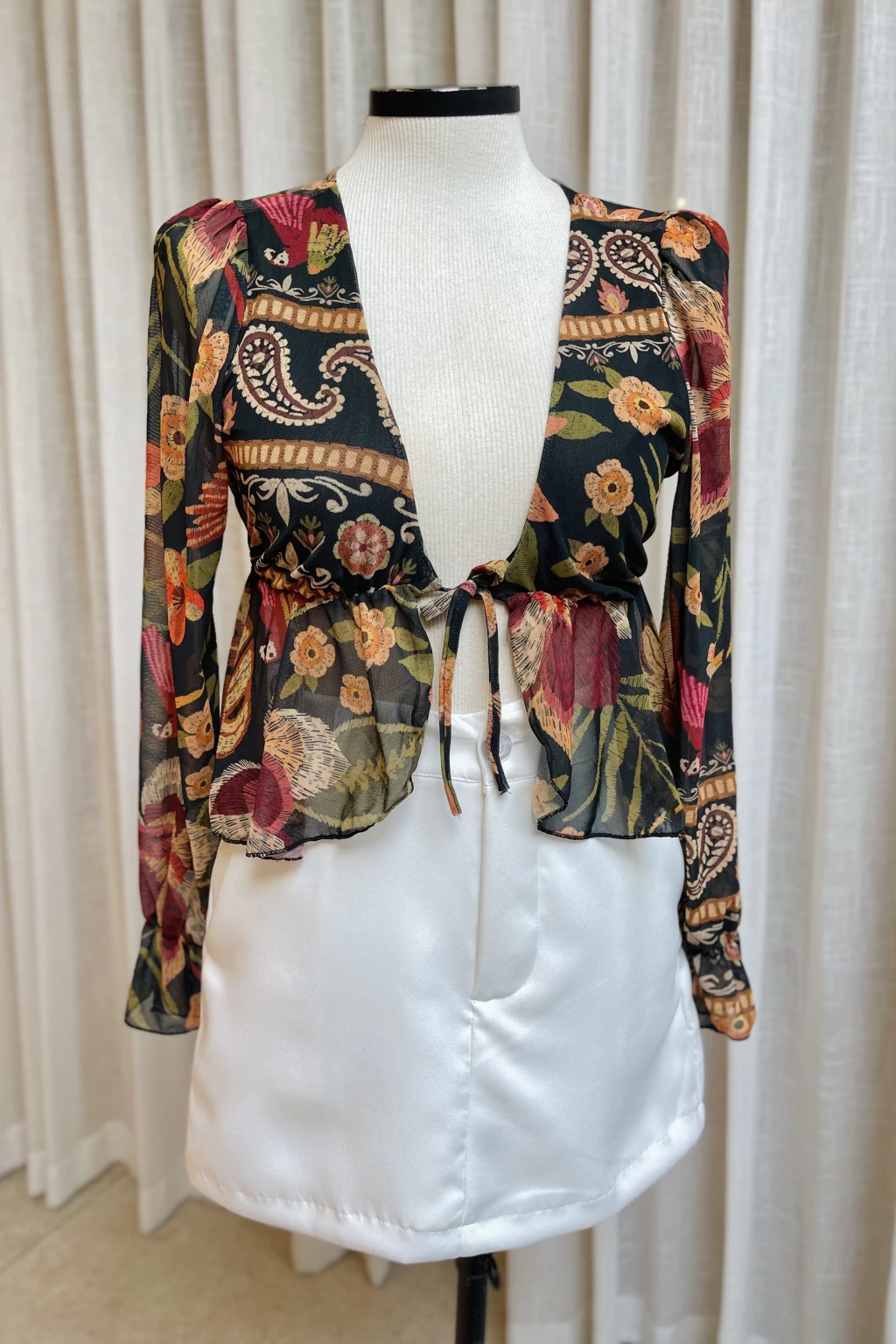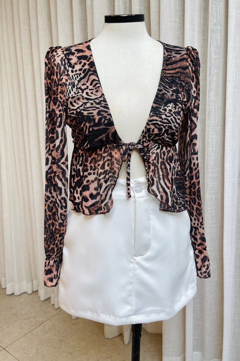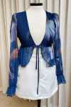 Leve e elegante, esta blusa de tule traz um visual moderno e delicado com suas mangas longas transparentes e modelagem fluida. Possui abertura frontal com amarração, permitindo ajuste personalizado e caimento versátil.