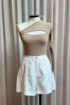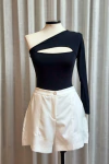 Combine com calças de cintura alta, saias ajustadas ou peças de alfaiataria; finalize com salto fino e acessórios delicados para valorizar o decote e a assimetria da peça.