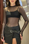 Body confeccionado em tule leve e delicado, com toque macio e caimento ajustado ao corpo. O modelo possui mangas longas, proporcionando um visual elegante e sofisticado, além de valorizar a silhueta com transparência sutil e efeito moderno.