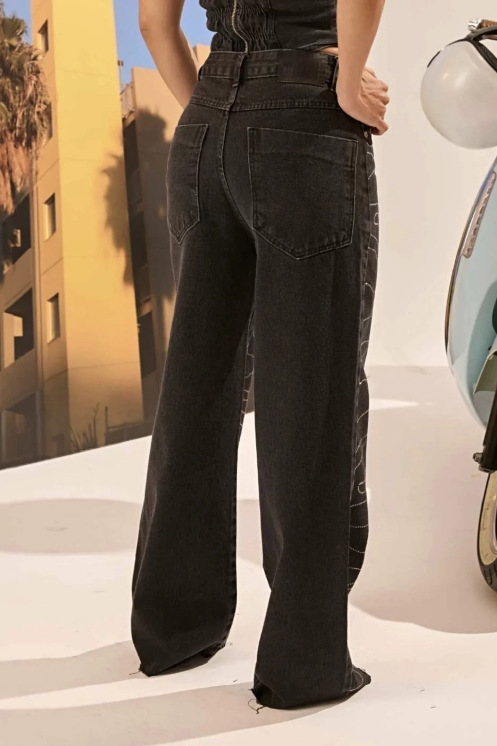 A Calça Tamires chega com aquela pegada fashionista que transforma qualquer look. Feita em jeans preto, ela traz aplicações em desenho que iluminam a peça de forma moderna e super antenada. O caimento é confortável, reto e alongado, entregando presença e aquele ar de mulherão conectada às tendências. Conta com fechamento por zíper e botão metálico, além de cós com passantes e bolsos funcionais.