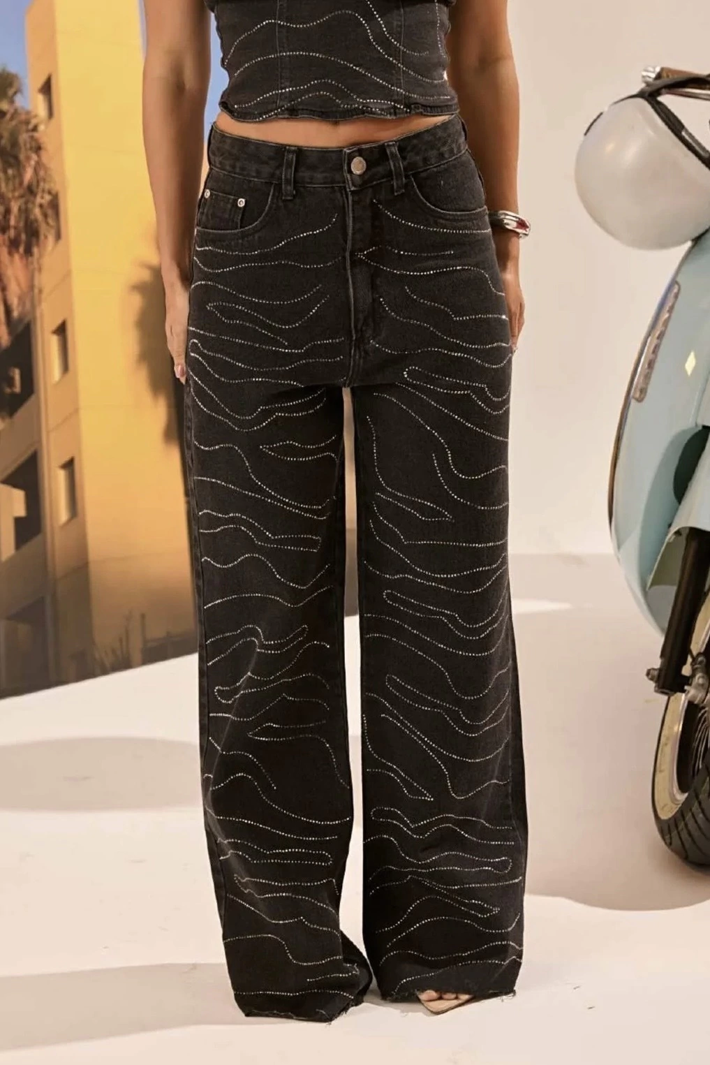Combine com blusas mais neutras, tops básicos ou camisas lisas para equilibrar o brilho dos strass. Nos pés, aposte em sandálias de salto, botas ou até tênis estilosos para um toque despojado. Acessórios minimalistas completam o look sem competir com o destaque da calça.