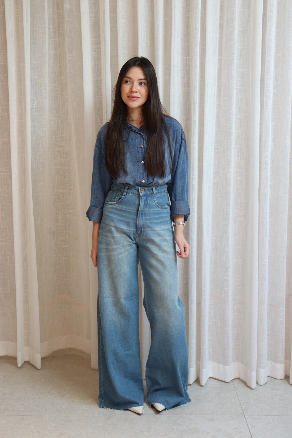 Calça jeans wide leg, com modelagem de pernas amplas e caimento reto desde o quadril, oferecendo conforto e estilo em igual medida. A lavagem e a barra desfiada garantem um toque urbano e versátil. Conta com bolsos frontais e traseiros funcionais, perfeitos para unir praticidade ao design. O cós com passantes permite o uso de cintos e complementa o visual com funcionalidade. Fechamento frontal por zíper e botão, garantindo ajuste seguro e clássico.