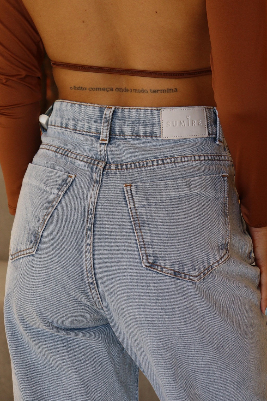 Calça Mom Sumire, produção própria com lavagem marmorizada, com visual vintage e toque contemporâneo. Conta com cintura alta, modelagem levemente afunilada nas pernas e barra feita, oferece um caimento estruturado que valoriza a silhueta com conforto. Possui bolsos frontais e traseiros funcionais, cós com passantes para cintose e fechamento por zíper e botão metálico, garantindo praticidade e segurança.