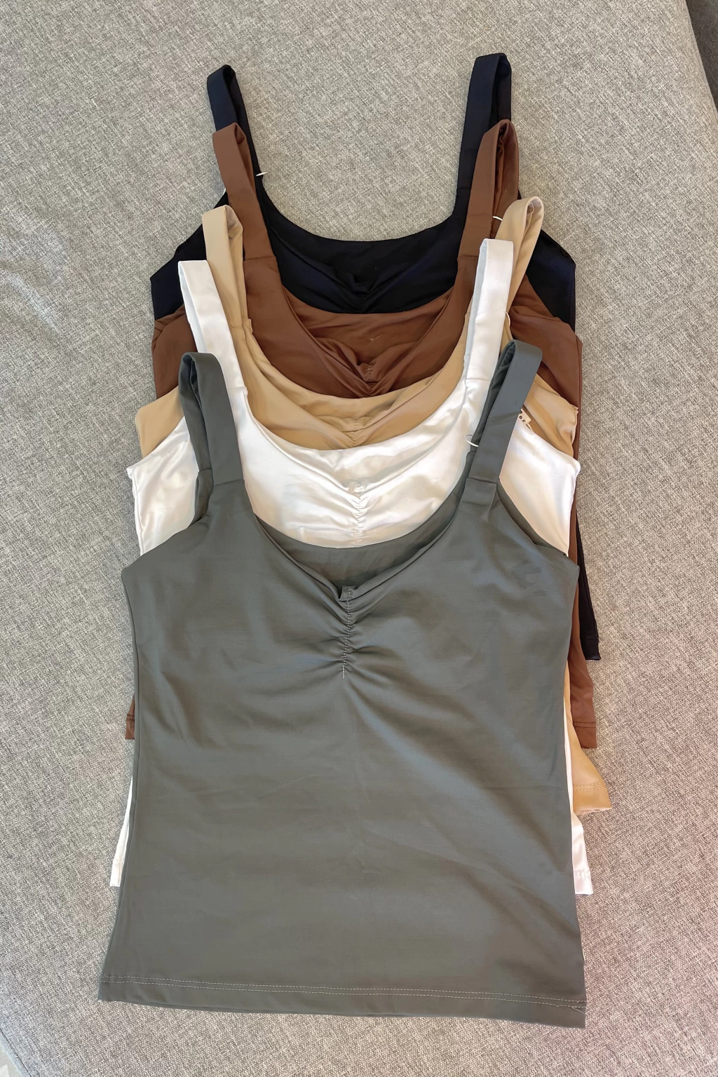 Blusa confeccionada em poliamida com toque macio, caimento leve e excelente elasticidade. Possui alças médias e decote em U, com franzido delicado no busto que valoriza a região e cria um efeito sutil de volume. O modelo proporciona conforto e um visual feminino, elegante e moderno.