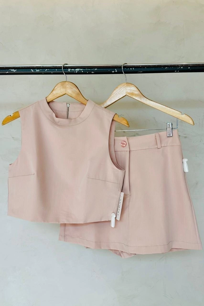 Conjunto confeccionado em alfaiataria, composto por blusa e short, unindo sofisticação e modernidade em uma única produção. A blusa apresenta modelagem estruturada com gola alta e fechamento posterior em zíper metálico, além de recorte triangular na parte de trás, que adiciona um toque contemporâneo e ousado ao visual. O short possui cintura alta, bolsos frontais e traseiros embutidos, além de fechamento por zíper e botão, garantindo um caimento impecável e elegante.