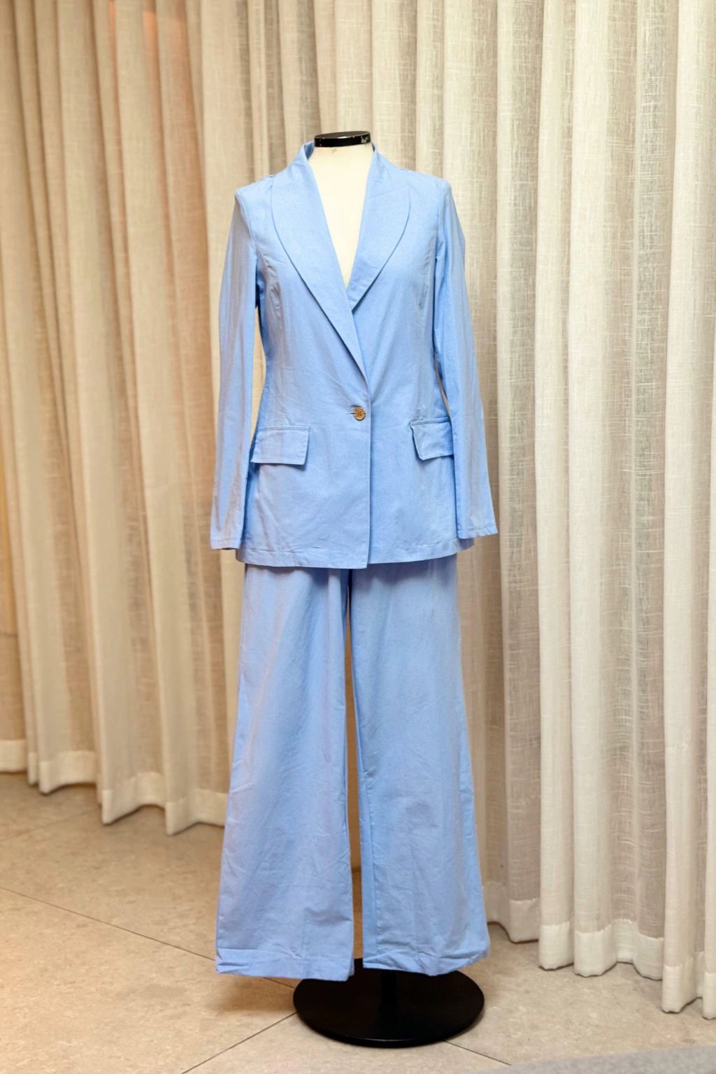 Conjunto confeccionado de tecido de linho em algodão, composto por blazer com gola arredondada, bolsos fakes e um botão frontal para fechamento, e calça estilo wide leg, com elástico nas costas, zíper e botão para fechamento e bolsos laterais funcionais.
