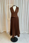 Conjunto de alfaiataria sofisticado composto por colete cropped e saia midi plissada. O colete apresenta modelagem estruturada com gola tradicional e fechamento frontal por botões revestidos, conferindo um toque elegante e moderno à peça. A saia midi possui comprimento fluido com pregas delicadas que proporcionam movimento e leveza ao visual, além de fechamento por zíper invisível, garantindo praticidade e acabamento refinado.