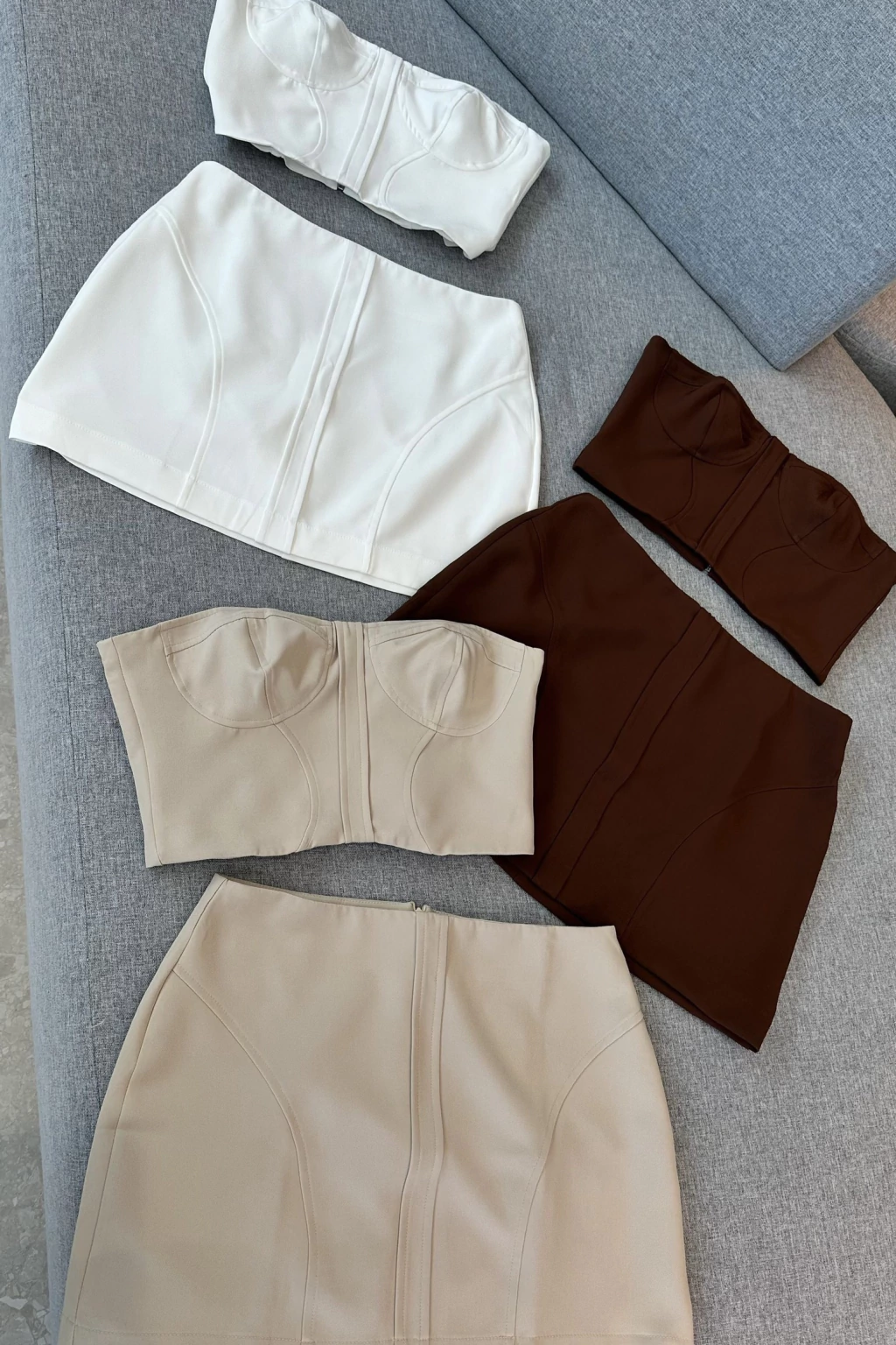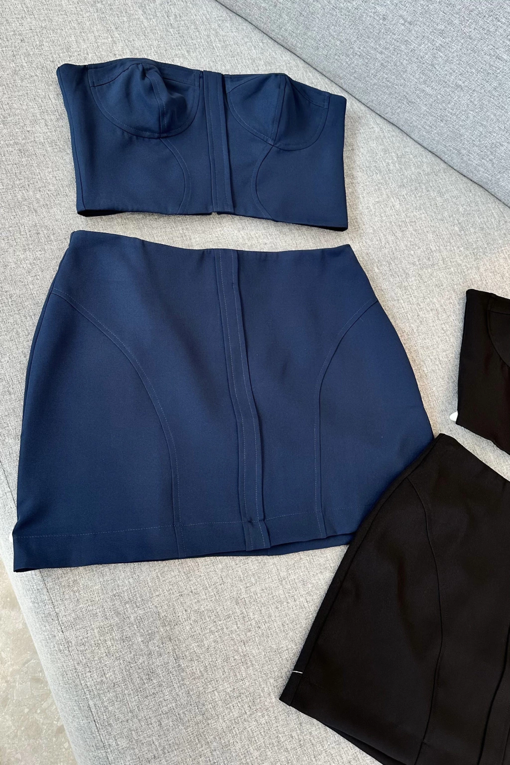 Conjunto confeccionado em tecido estruturado com toque macio, caimento impecável e excelente elasticidade. O cropped possui modelagem estilo corset, com recortes marcados que valorizam o busto e a silhueta e acabamento bem estruturado, garantindo sustentação e um visual moderno e elegante. A saia apresenta cintura alta, fechamento por zíper e recortes frontais que alongam a silhueta e um caimento justo que realça as curvas de forma sofisticada.