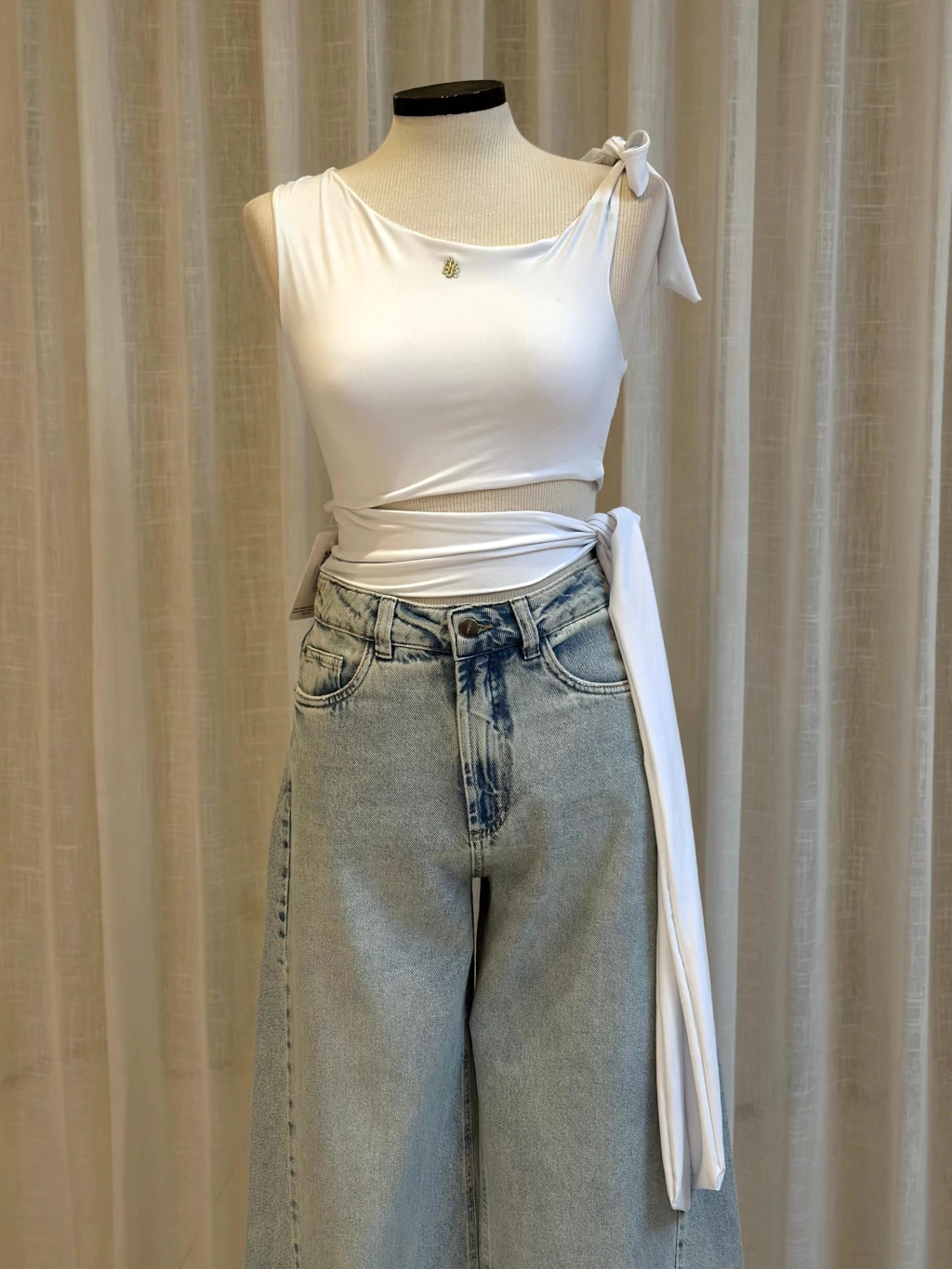 Cropped confeccionado em poliamida com toque macio, caimento justo e excelente elasticidade. Possui decote assimétrico moderno, com alça única que conta com detalhe de amarração no ombro, adicionando estilo e charme ao visual. Apresenta faixa longa para amarração na cintura, permitindo ajuste personalizado e garantindo um acabamento sofisticado e feminino.