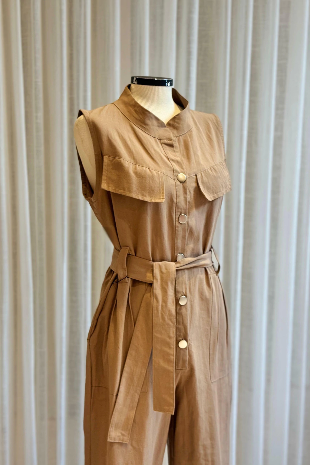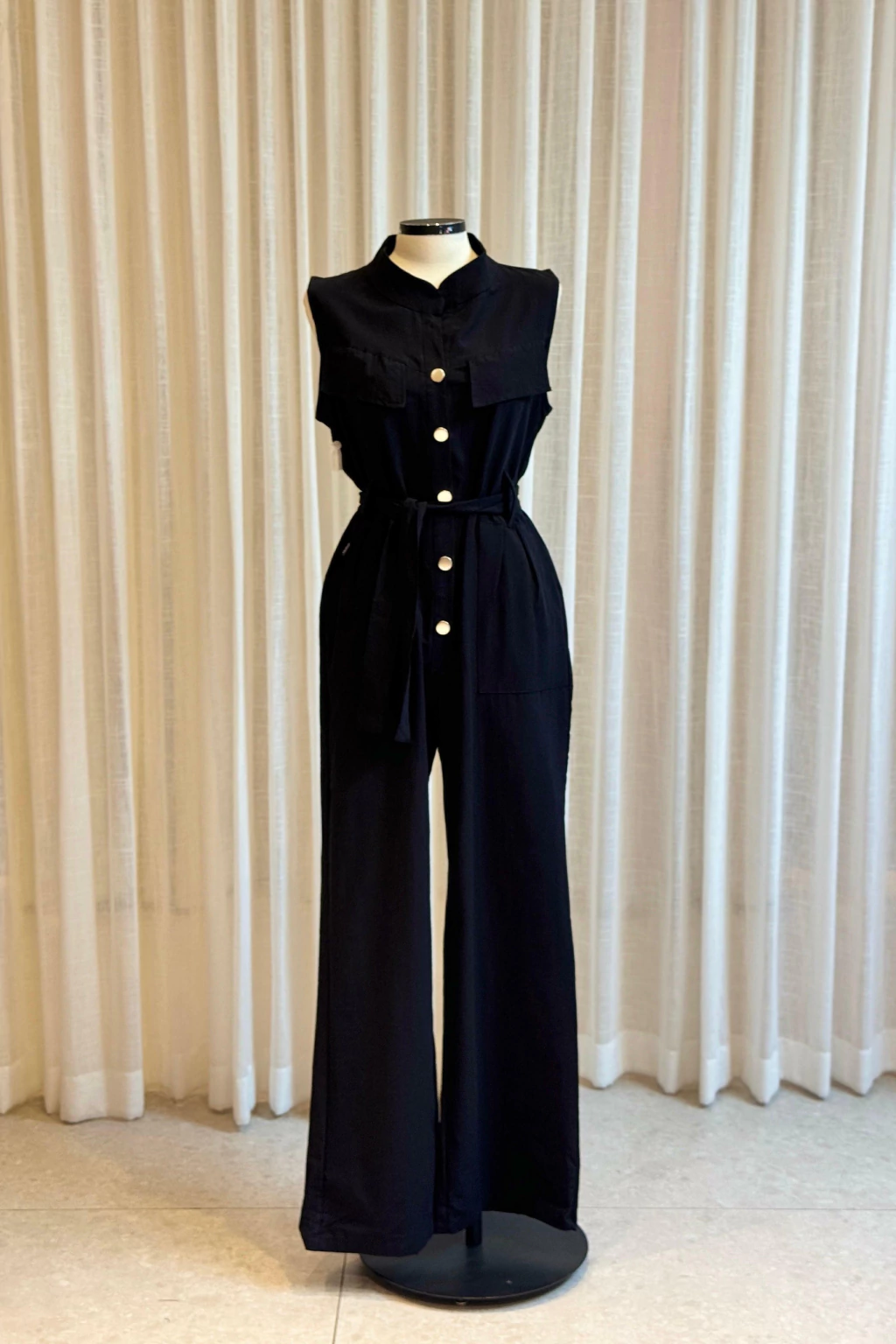 Este macacão longo é a combinação perfeita entre sofisticação e praticidade. Sem mangas, ele valoriza os ombros e proporciona um visual moderno e elegante. O modelo conta com fechamento frontal por botões, garantindo facilidade ao vestir e um charme extra ao design. Apresenta bolsos frontais fakes, que adicionam um toque utilitário sem interferir na silhueta, além de passantes na cintura que acompanham um cinto do mesmo tecido — ideal para ajustar e valorizar a cintura com harmonia.