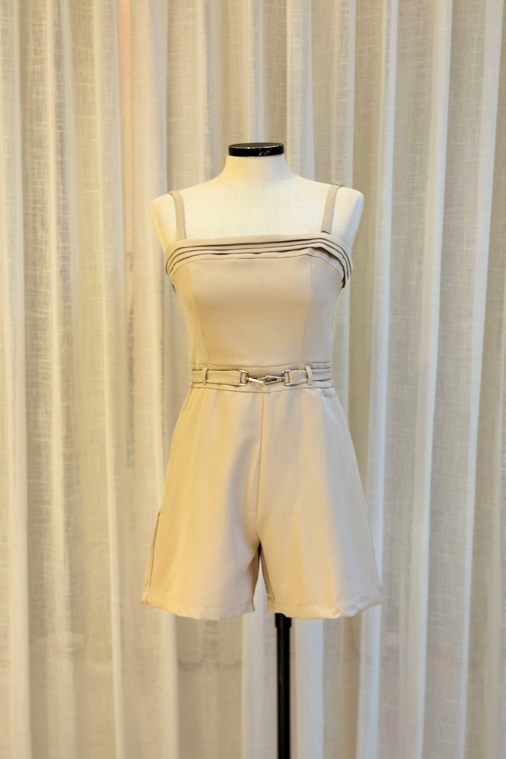 Macaquinho confeccionado em tecido encorpado e de toque macio, com caimento estruturado que valoriza a silhueta. O modelo possui alças finas, decote reto com detalhe franzido e acabamento pespontado na parte superior, conferindo um charme delicado ao look. Conta ainda com cinto e fivela metálica frontal, agregando sofisticação e estilo. A modelagem é acinturada com shorts de corte reto e confortável, ideal para diversas ocasiões.