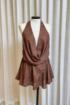Macaquinho em crepe chifon, com decote profundo em V e alças halter que valorizam o colo e a região dos ombros. Possui sobreposição frontal que cria movimento delicado e caimento soltinho, garantindo conforto sem perder a sofisticação. Ideal para ocasiões casuais ou eventos diurnos que pedem um visual leve e elegante.