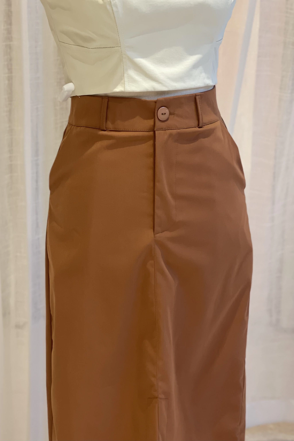 Saia midi confeccionada em tecido de alfaiataria, com toque estruturado e caimento elegante. Possui fenda frontal que adiciona um toque moderno e facilita a mobilidade. Conta com cós com passantes para cinto, permitindo diferentes composições, além de bolsos funcionais que unem praticidade e estilo. O fechamento é feito por zíper e botão frontal, garantindo um ajuste seguro e sofisticado.