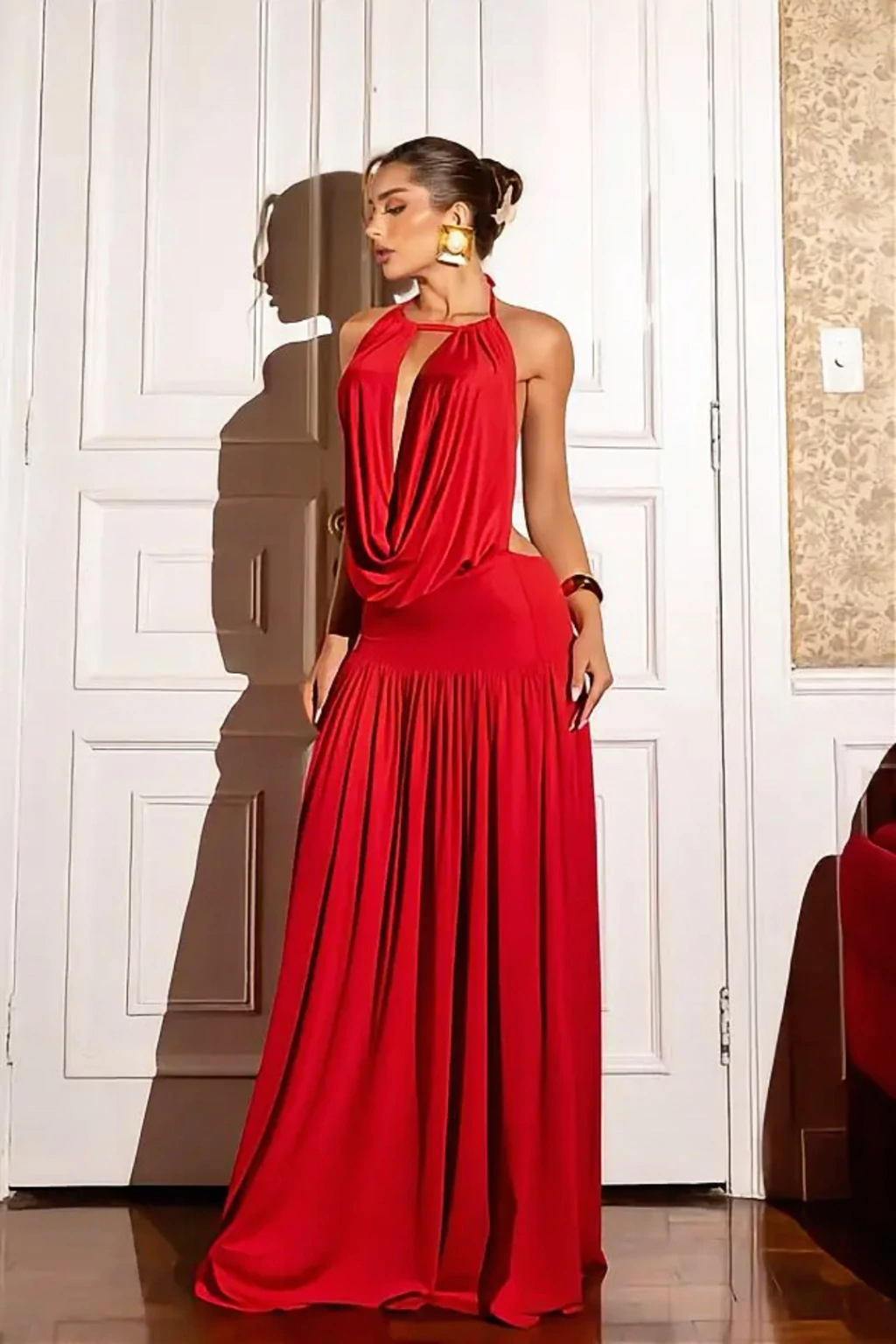 Vestido confeccionado em poliamida com toque macio, caimento fluido e excelente elasticidade. Possui modelagem longa com saia ampla, decote halter com drapeado frontal e detalhe de abertura no busto, garantindo um visual elegante e moderno. Nas costas, apresenta recorte totalmente aberto com amarração no pescoço, permitindo ajuste personalizado e valorizando a silhueta com sofisticação.