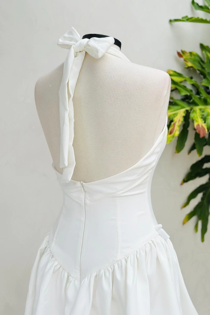 Vestido confeccionado em alfaiataria com toque estruturado, caimento impecável e excelente acabamento. Possui decote reto com modelagem estilo halter e amarração no pescoço, que proporciona ajuste personalizado e destaca a região dos ombros. A parte superior tem recortes que valorizam a silhueta, enquanto a saia evasê com leve franzido acrescenta movimento e feminilidade ao visual. O fechamento em zíper nas costas garante praticidade e melhor ajuste ao corpo.