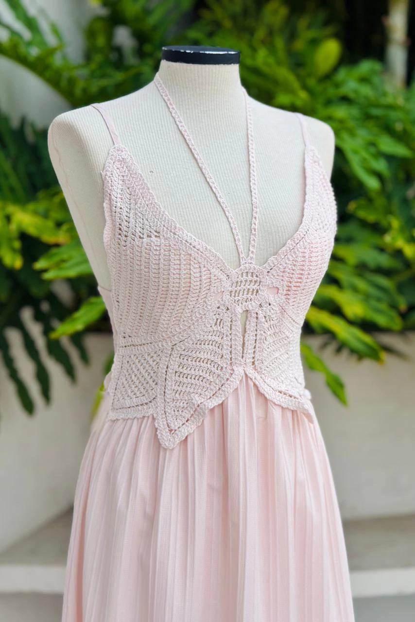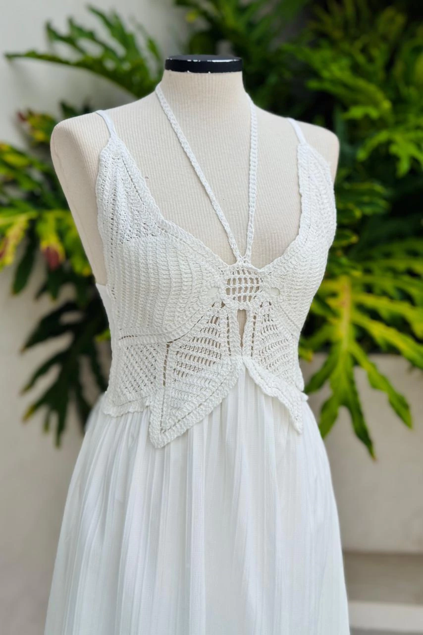 Vestido longo confeccionado com aplicação no busto em crochê e saia em tecido leve, oferecendo toque macio, caimento fluido e visual delicado. Possui alças finas, decote em V e trabalho artesanal no busto, que adiciona charme e valoriza a região. A saia apresenta modelagem soltinha com recorte franzido, garantindo movimento e frescor ao look — perfeito para dias mais quentes. Possui lastex nas costas, que garante ajuste perfeito no corpo.