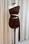 Vestido confeccionado em tule com toque leve, caimento fluido e excelente elasticidade. Aapresenta design assimétrico com ombro único, trazendo um visual moderno e sofisticado. Possui recortes estratégicos na cintura e faixa longa para amarração, permitindo ajuste personalizado e valorizando a silhueta. A saia curta drapeada adiciona charme e movimento, criando um look marcante e elegante.