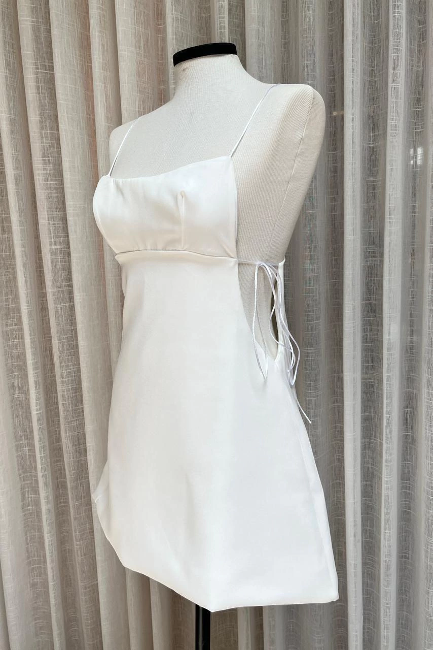 Vestido Day confeccionado em tecido de alfaiataria com caimento estruturado e toque suave. O modelo é curto e conta com alças finas e decote reto, que valorizam o colo de forma delicada e elegante. Possui abertura lateral com detalhe de amarração, adicionando um toque moderno e charmoso, além de permitir um ajuste personalizado ao corpo.