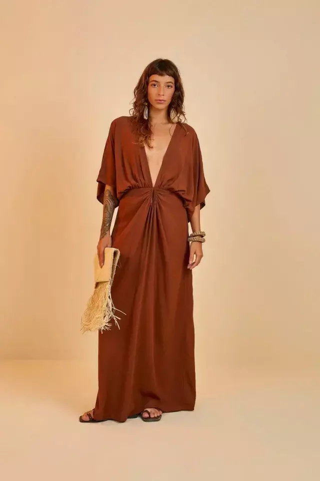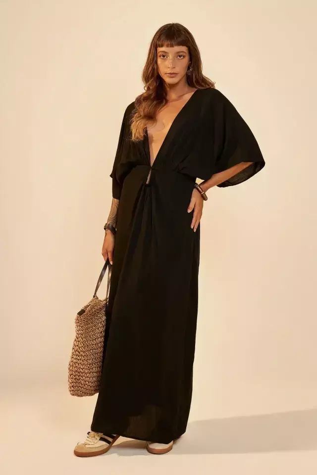 Vestido cropped reto com mangas amplas e decote profundo em V na frente e nas costas. Possui recorte franzido em formato de gota na cintura, com fecho em colchete. Possui fecho com zíper nas costas.
