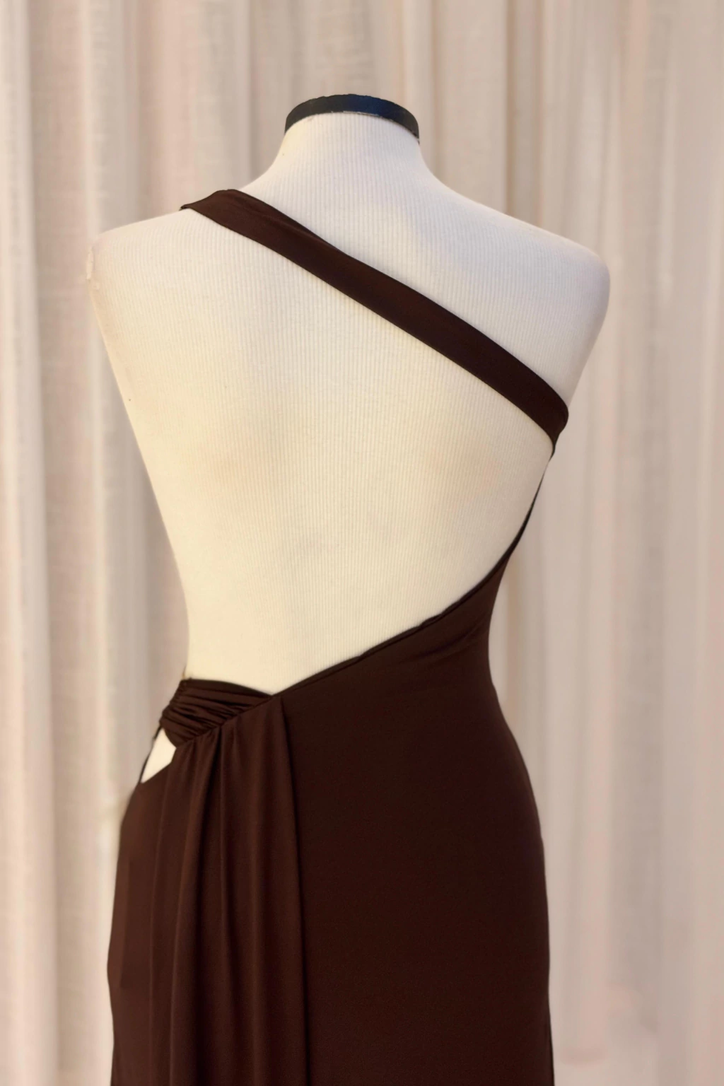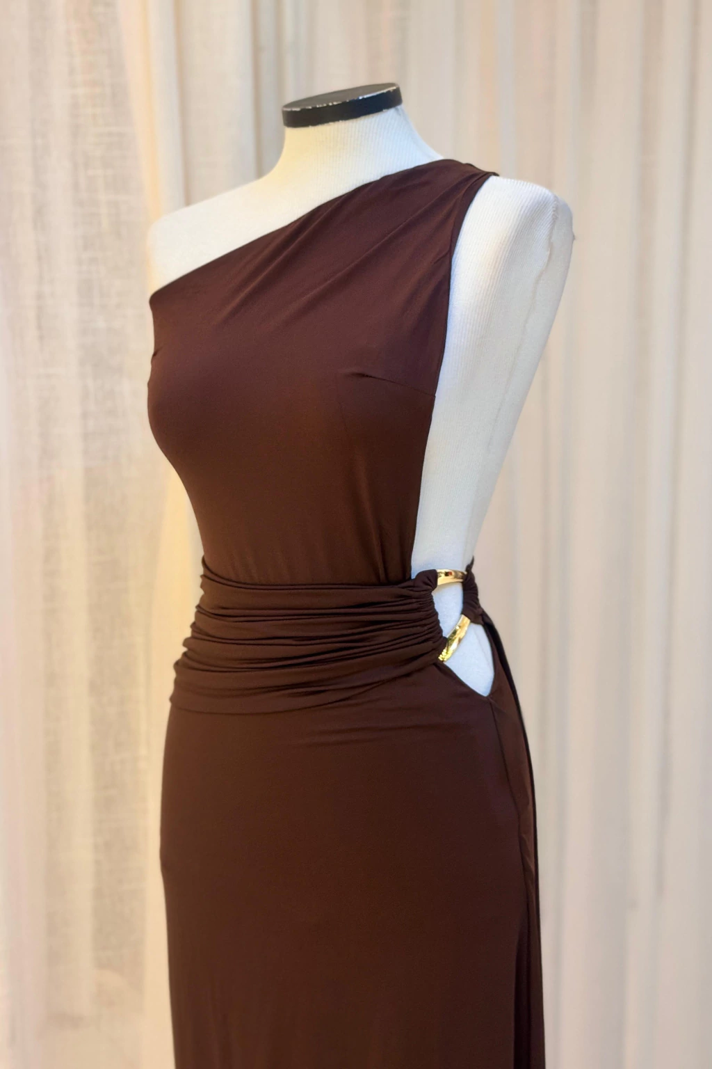 Vestido confeccionado em poliamida com toque suave, caimento fluido e excelente elasticidade. Possui modelagem justa ao corpo, decote de um ombro só e recorte lateral com detalhe de argola metálica dourada e costas nuas, que adicionam charme e sofisticação à peça. A cintura apresenta leve drapeado que valoriza a silhueta e traz um toque moderno ao visual. O comprimento longo completa a proposta elegante e feminina do modelo.