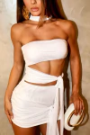 Vestido confeccionado em tule leve e maleável, trazendo transparência delicada e caimento fluido. Possui design moderno e super feminino, com busto faixa estruturado e detalhe de amarração longa que contorna a cintura, permitindo diferentes formas de ajuste e valorizando a silhueta. A saia apresenta efeito drapeado lateral, criando volume elegante e destacando o visual com um toque sofisticado. O comprimento curto e o tule sobreposto oferecem um efeito visual refinado, enquanto as amarrações laterais e frontais adicionam charme e movimento à peça.