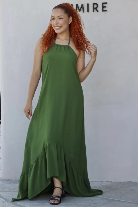 Vestido longo feito em tecido viscose com amarração no pescoço. Peça leve, fluida e ideal para climas mais quentes. A viscose proporciona um caimento suave e confortável, enquanto a amarração no pescoço adiciona um toque elegante e delicado, muitas vezes criando um decote halter ou estilo frente única.