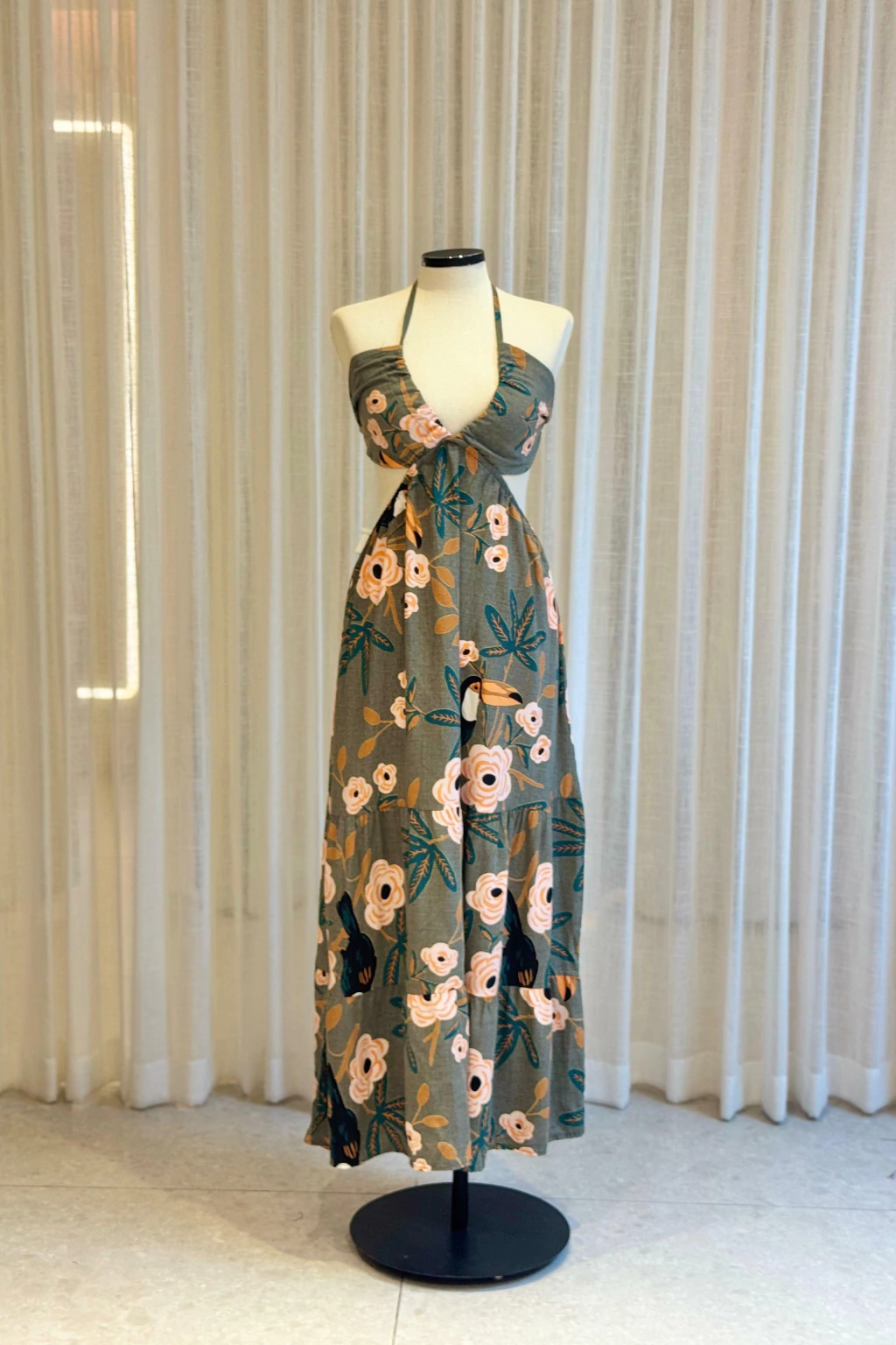 Vestido longo plus size em tecido leve de viscose, com modelagem soltinha, decote halter com amarração no pescoço e detalhe franzido no busto. Ideal para quem busca conforto e estilo em uma única peça.