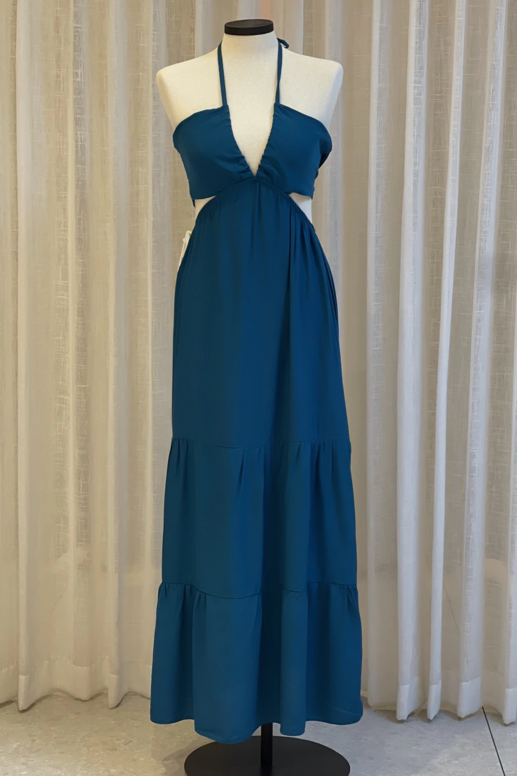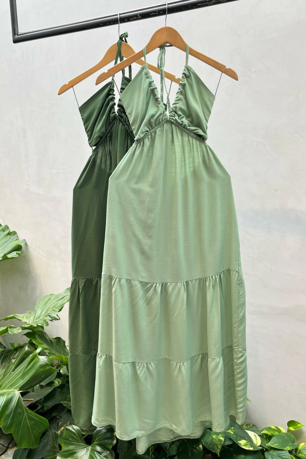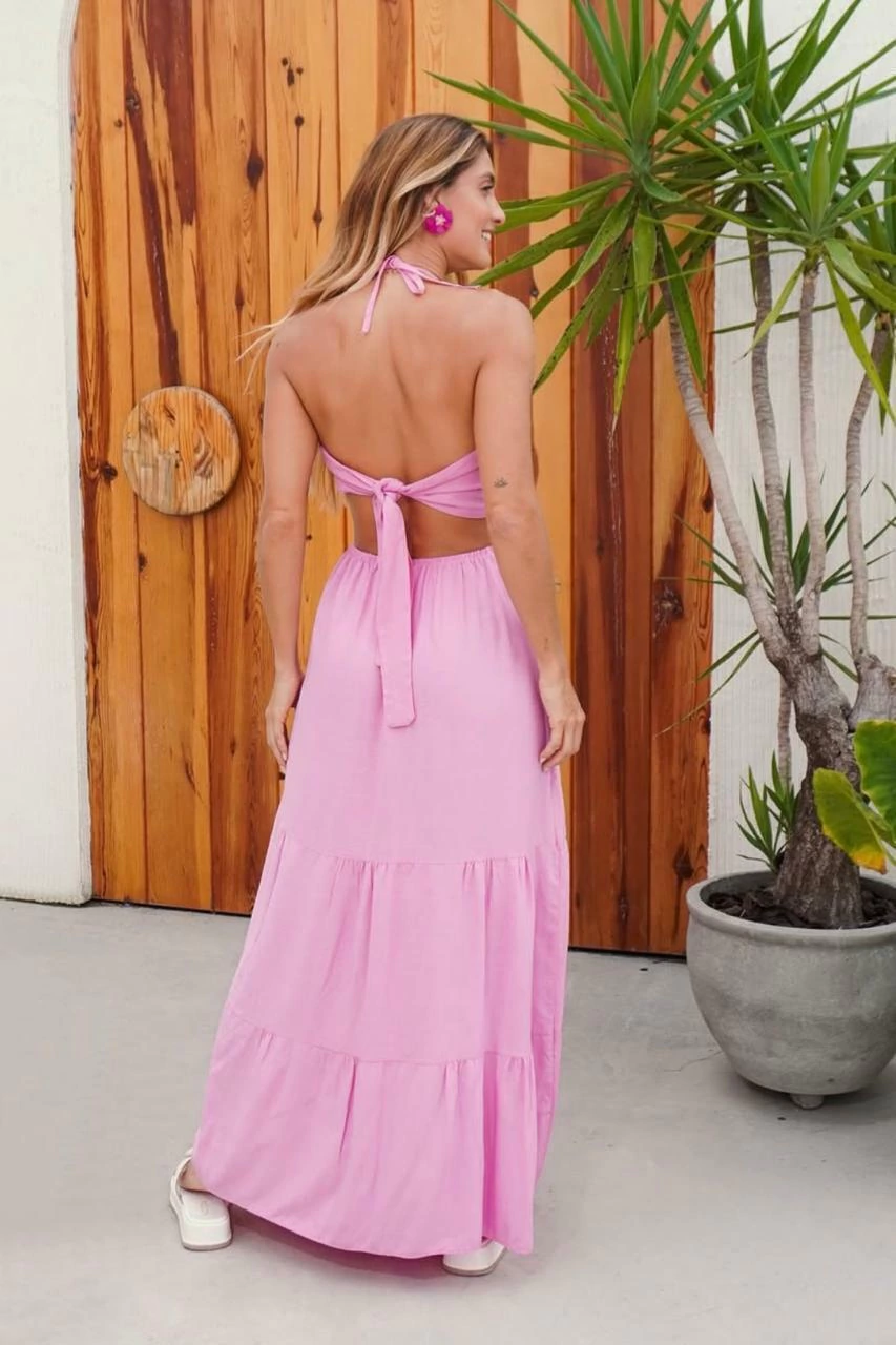Vestido longo em tecido leve de viscose, com modelagem soltinha, decote halter com amarração no pescoço e detalhe franzido no busto. Ideal para quem busca conforto e estilo em uma única peça.