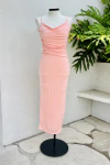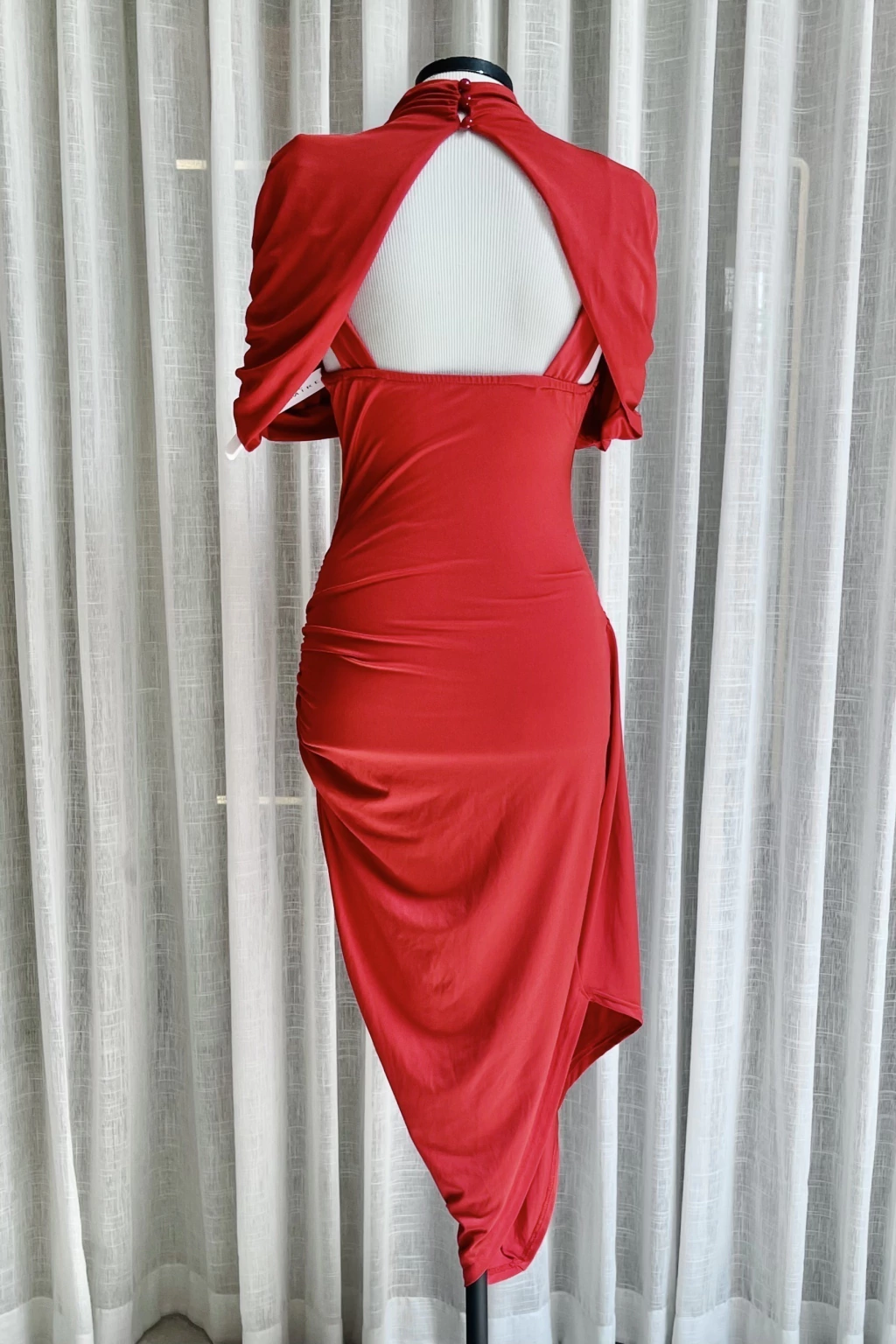 Vestido midi confeccionado em poliamida com toque sedoso, caimento leve e excelente elasticidade. O modelo possui gola alta e mangas curtas com drapeados volumosos que criam um efeito sofisticado e elegante. Apresenta franzidos estratégicos na região da saia, valorizando as curvas e proporcionando um visual fluido e moderno. O design assimétrico na barra adiciona movimento e um toque fashion à peça.