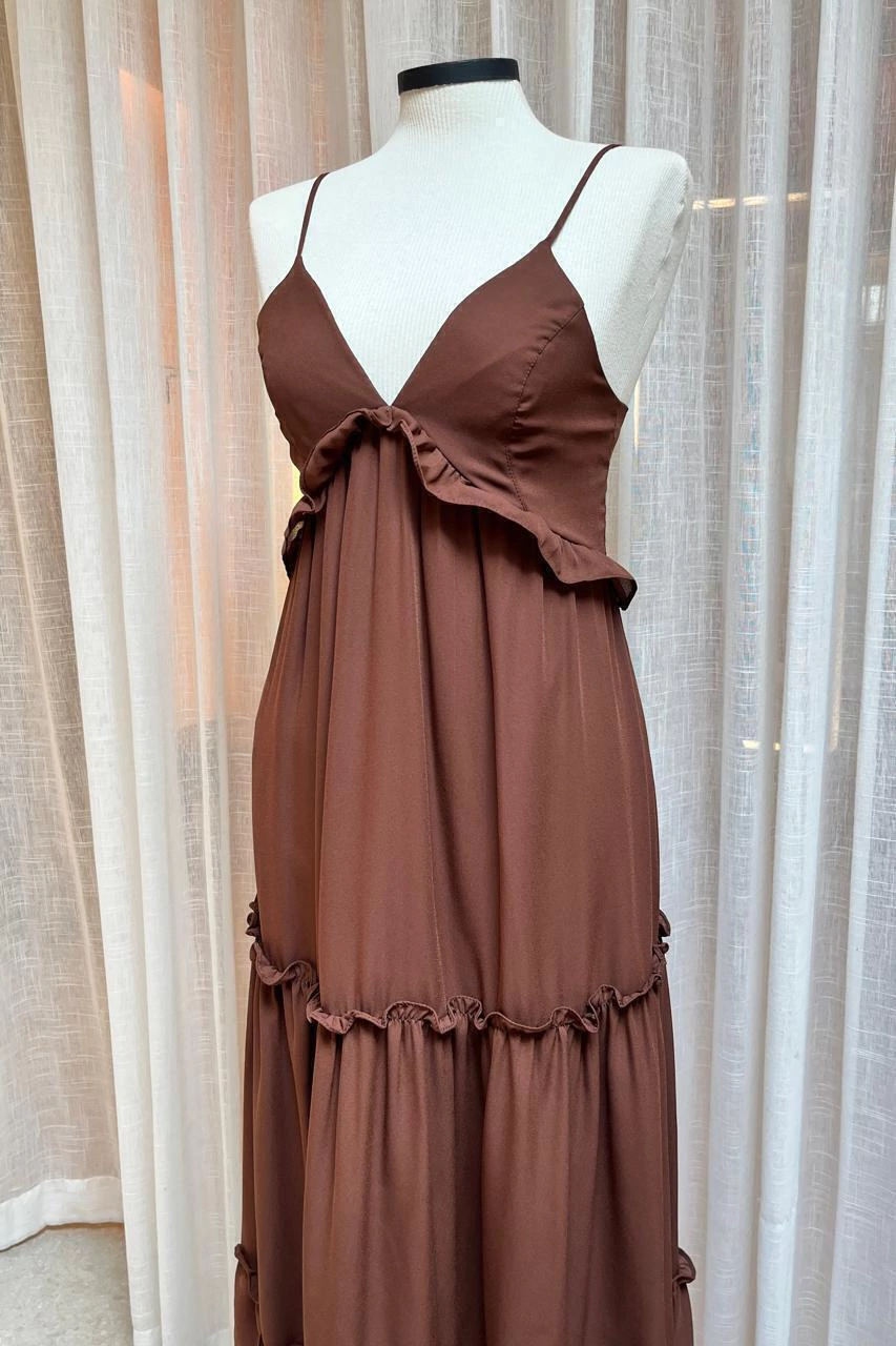 Vestido longo confeccionado em crepe leve, com toque suave e caimento fluido que proporciona movimento e elegância ao look. Possui alças finas, decote em V e um delicado babado abaixo do busto, trazendo feminilidade e charme. A saia longa é composta por camadas com franzidos, criando volume sutil e um visual romântico. Nas costas, o vestido conta com lastex, garantindo melhor ajuste ao corpo, conforto e excelente elasticidade.