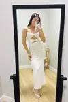 Vestido midi confeccionado em tecido marant, conhecido pelo toque leve e caimento fluido que valoriza o movimento. Possui alças finas e busto justo que realça a silhueta com delicadeza, além de recorte horizontal logo abaixo do busto, criando um efeito sutilmente acinturado. A saia ampla completa o visual com elegância e leveza, garantindo conforto e um caimento sofisticado.