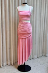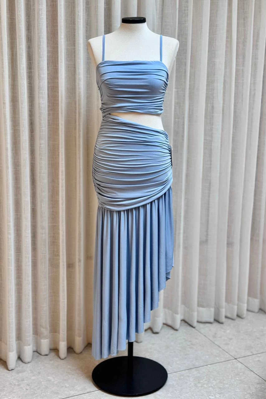 Vestido em malha leve confeccionado em poliamida, com toque macio, caimento fluido e excelente elasticidade. Apresenta top com alças finas e recorte drapeado, proporcionando ajuste confortável e efeito visual moderno. A saia possui cintura lateral assimétrica com drapeados que valorizam a silhueta, além de barra fluida em comprimento irregular, garantindo movimento e um look elegante e atual.