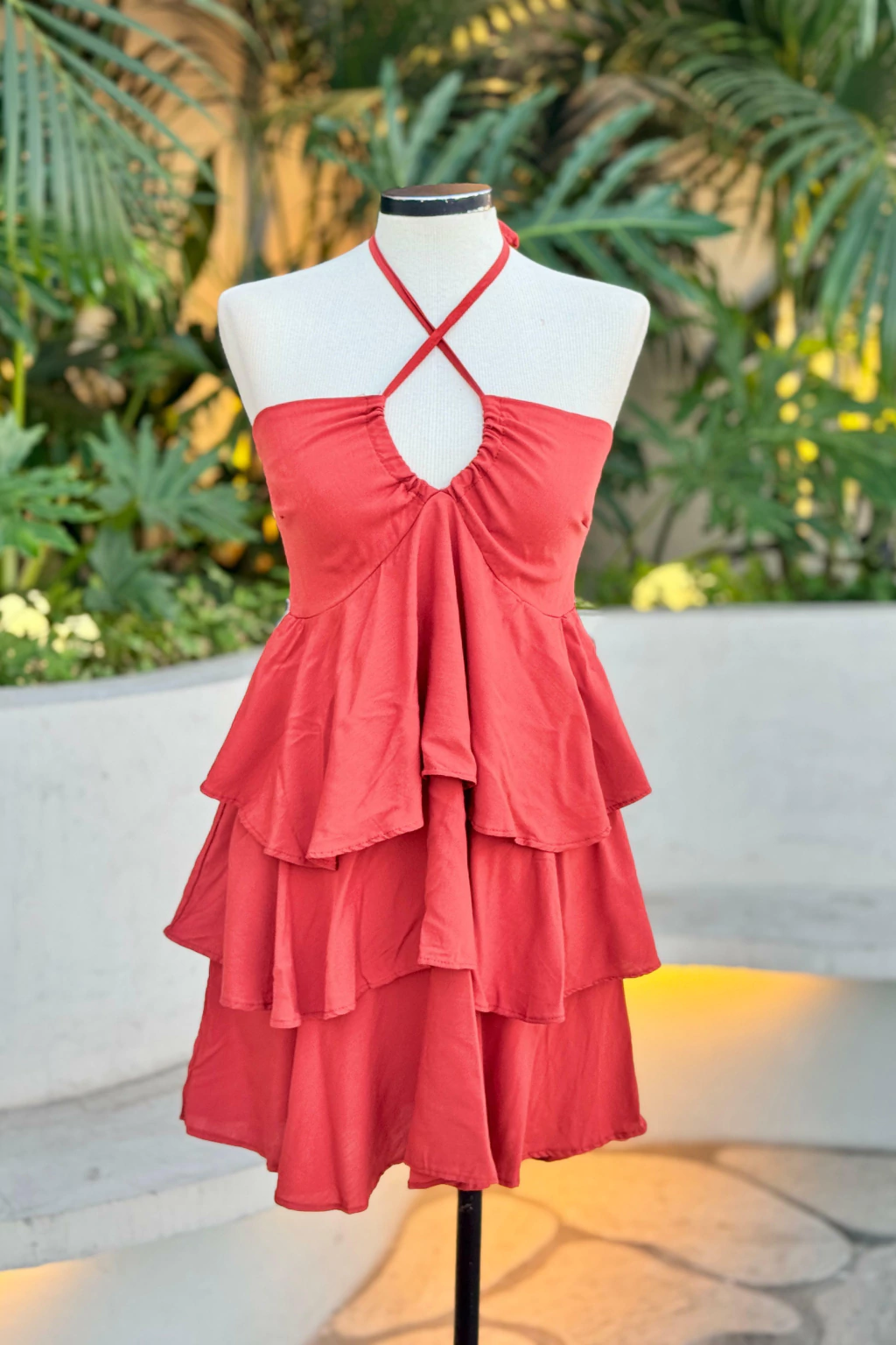 Vestido confeccionado em viscose com toque leve, caimento fluido e excelente movimento. Possui decote “V” com alças que formam detalhe cruzado no colo, trazendo charme e valorizando a região do busto. A saia conta com três camadas em babados, criando um efeito delicado e elegante. Nas costas, apresenta lastex, garantindo ajuste confortável e perfeito ao corpo.