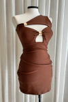 Vestido elegante e moderno, confeccionado em tecido de alta elasticidade, com toque suave e caimento ajustado. O modelo apresenta um design assimétrico, com um ombro único e um recorte estratégico na parte frontal, destacado por fivelas metálicas douradas, que conferem sofisticação e um toque de ousadia.
