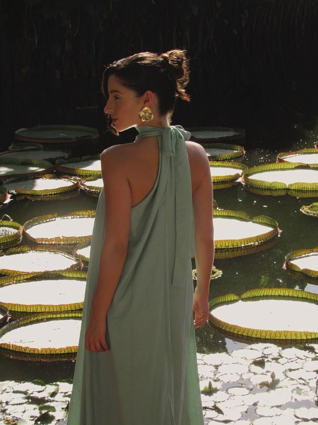 Vestido longo confeccionado em tecido leve e fluido, com caimento delicado que valoriza o movimento natural da peça. Possui gola alta com amarração na parte de trás do pescoço, conferindo um toque sofisticado e feminino ao visual. A modelagem solta proporciona conforto e elegância, ideal para composições graciosas e atemporais. O modelo transmite leveza e estilo, perfeito para diversas ocasiões.