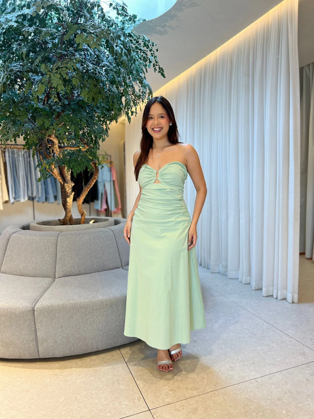 Vestido midi confeccionado em tecido leve com toque macio e caimento fluido, proporcionando elegância e conforto. Possui decote reto com detalhe franzido e pequena abertura no busto com fivela, que adiciona um toque moderno e feminino ao visual. O design tomara que caia valoriza os ombros e trazem delicadeza à peça. A modelagem ajustada na parte superior destaca a silhueta, enquanto a saia ampla e solta garante movimento natural e leveza ao caminhar. Fechamento por zíper na parte posterior. Possui forro.