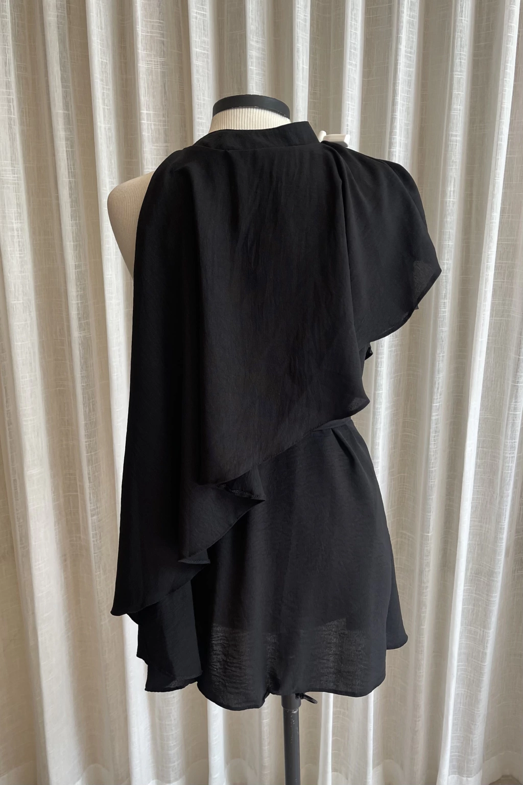 Vestido confeccionado em tecido leve e fluido, com toque suave e caimento elegante. O modelo apresenta design assimétrico com uma pala ampla sobreposta, que cria movimento e sofisticação ao visual. Possui gola alta com fechamento e recorte de um ombro só, deixando parte dos ombros à mostra de forma delicada e moderna. A saia curta com leve babado complementa o visual com feminilidade e charme.