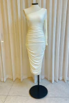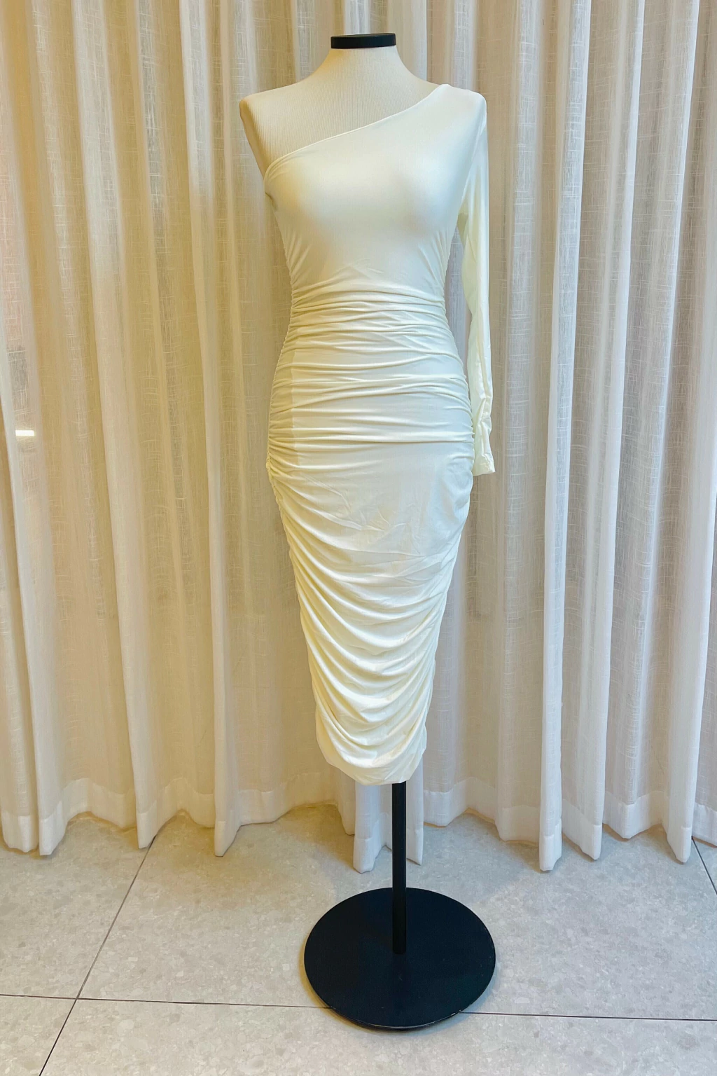 Vestido confeccionado em poliamida de alta qualidade, com toque macio, excelente elasticidade e caimento que valoriza a silhueta. Possui comprimento midi e modelagem ajustada ao corpo, destacando o drapeado lateral que confere sofisticação e realça as curvas de forma elegante. Apresenta manga longa única, que adiciona um toque moderno e assimétrico ao design, equilibrando sensualidade e refinamento.